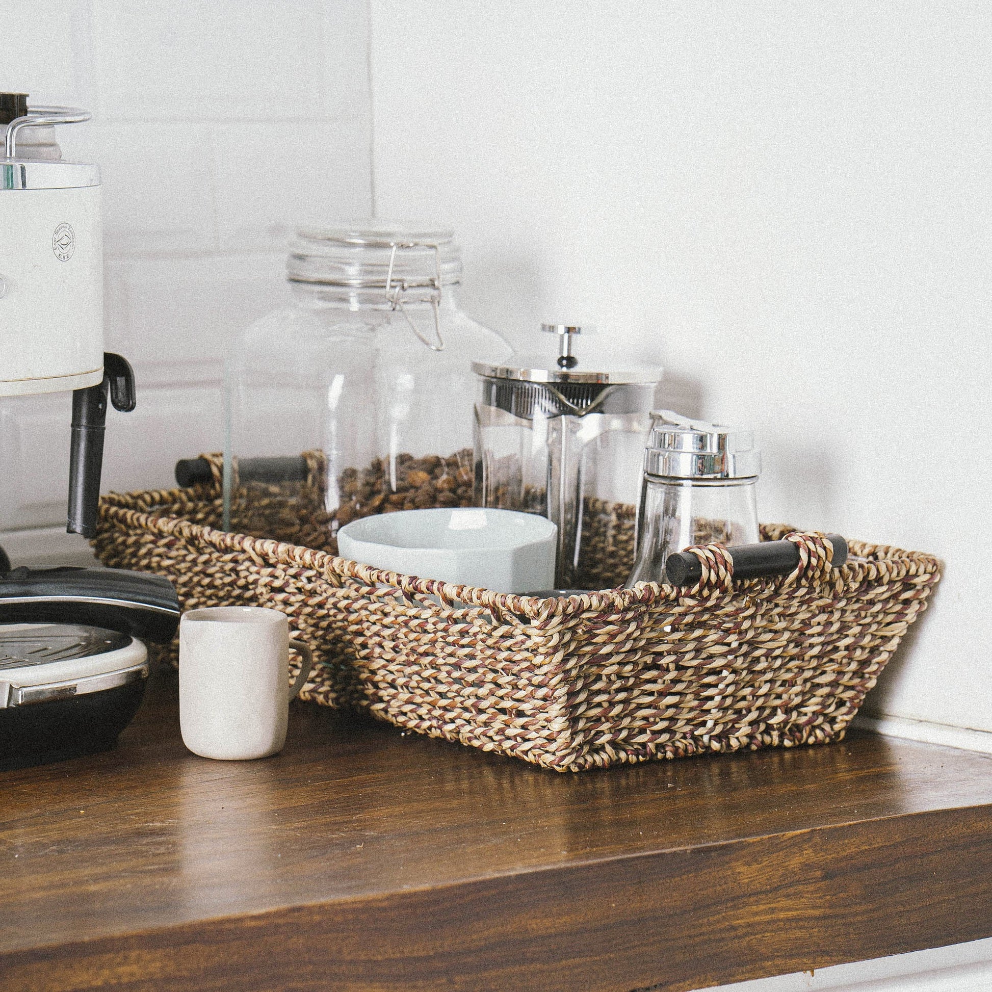 Handwoven from natural seagrass, this basket offers a rustic charm that complements a variety of décor styles, from farmhouse and coastal to bohemian and minimalist. The long, rectangular shape is perfect for coffee tables, shelves, countertops, or even as a unique serving tray. The sturdy wood handles add a touch of contrasting elegance and make it easy to carry.