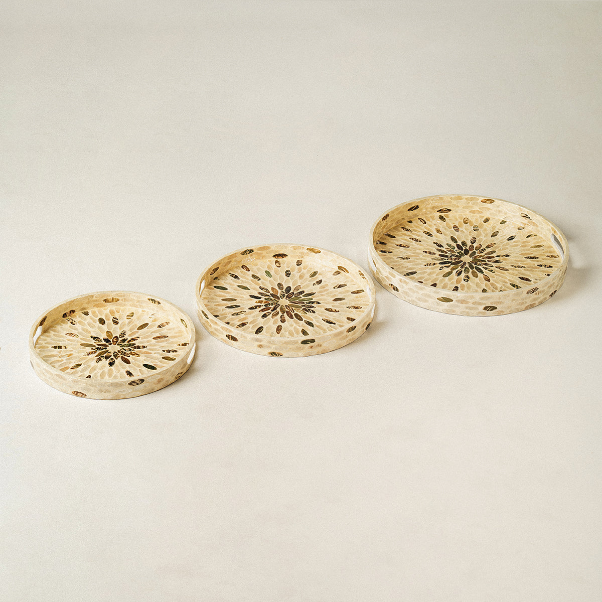 Each tray in this set of three features a breathtaking mother-of-pearl inlay, meticulously handcrafted by skilled artisans. The natural iridescence of the mother-of-pearl shimmers and catches the light, creating a captivating display. The radiating pattern, with its contrasting accents, adds a touch of modern sophistication to the classic round shape.
