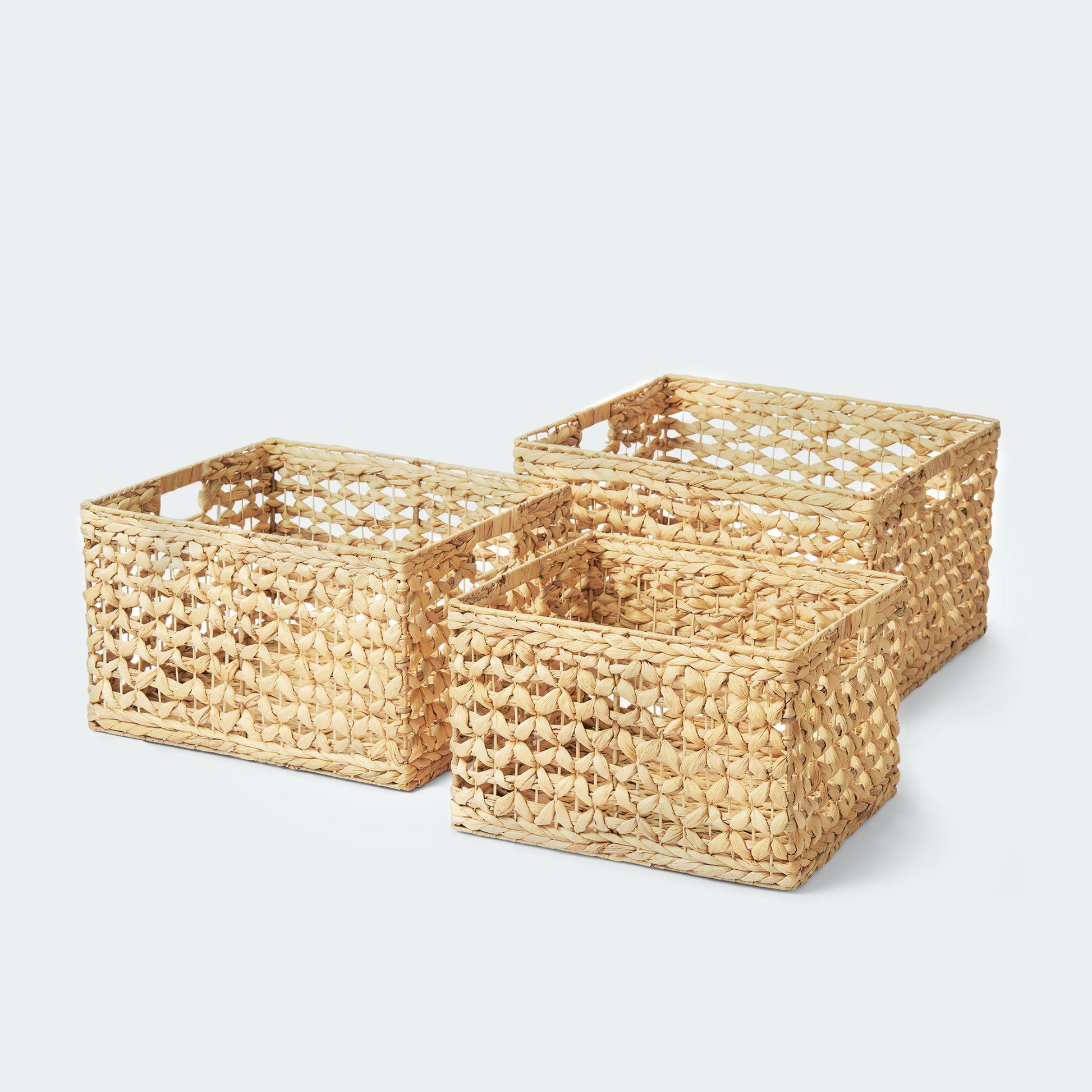 Large Water Hyacinth Cube Baskets with Open Weave and Handles, Set of 3
