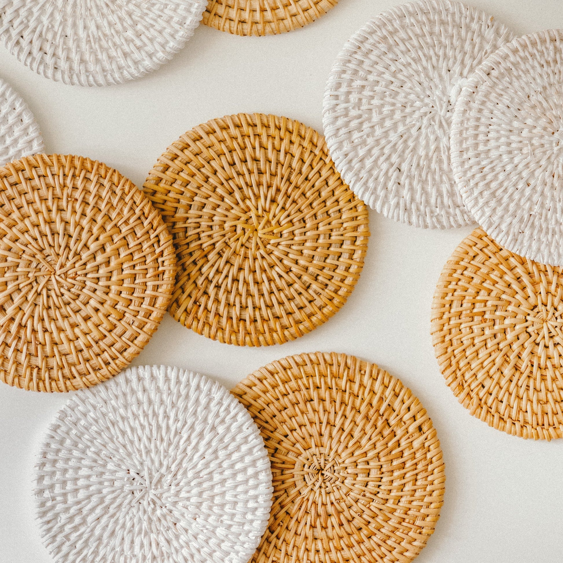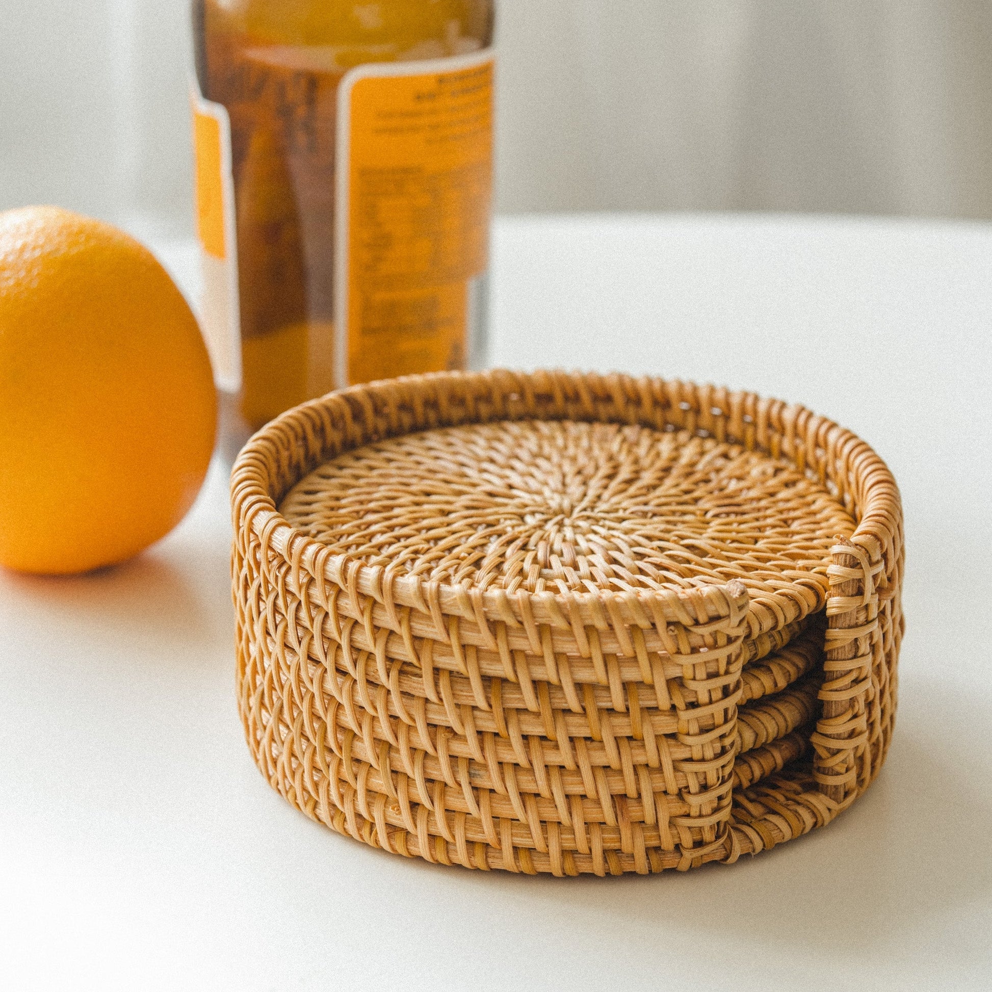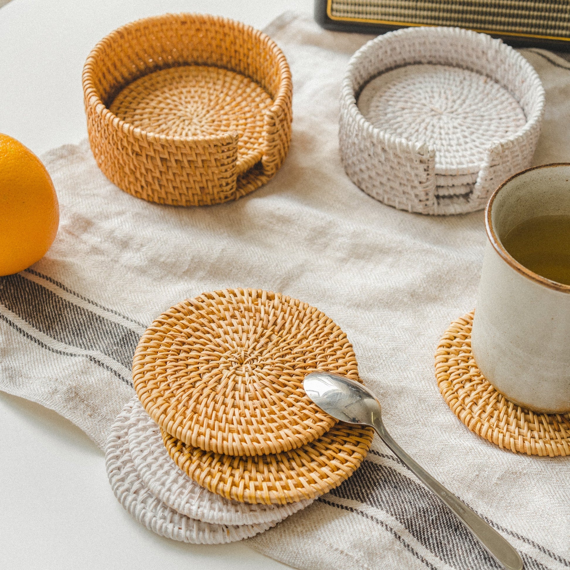 Round White and Orange Rattan Coaster Set of 6