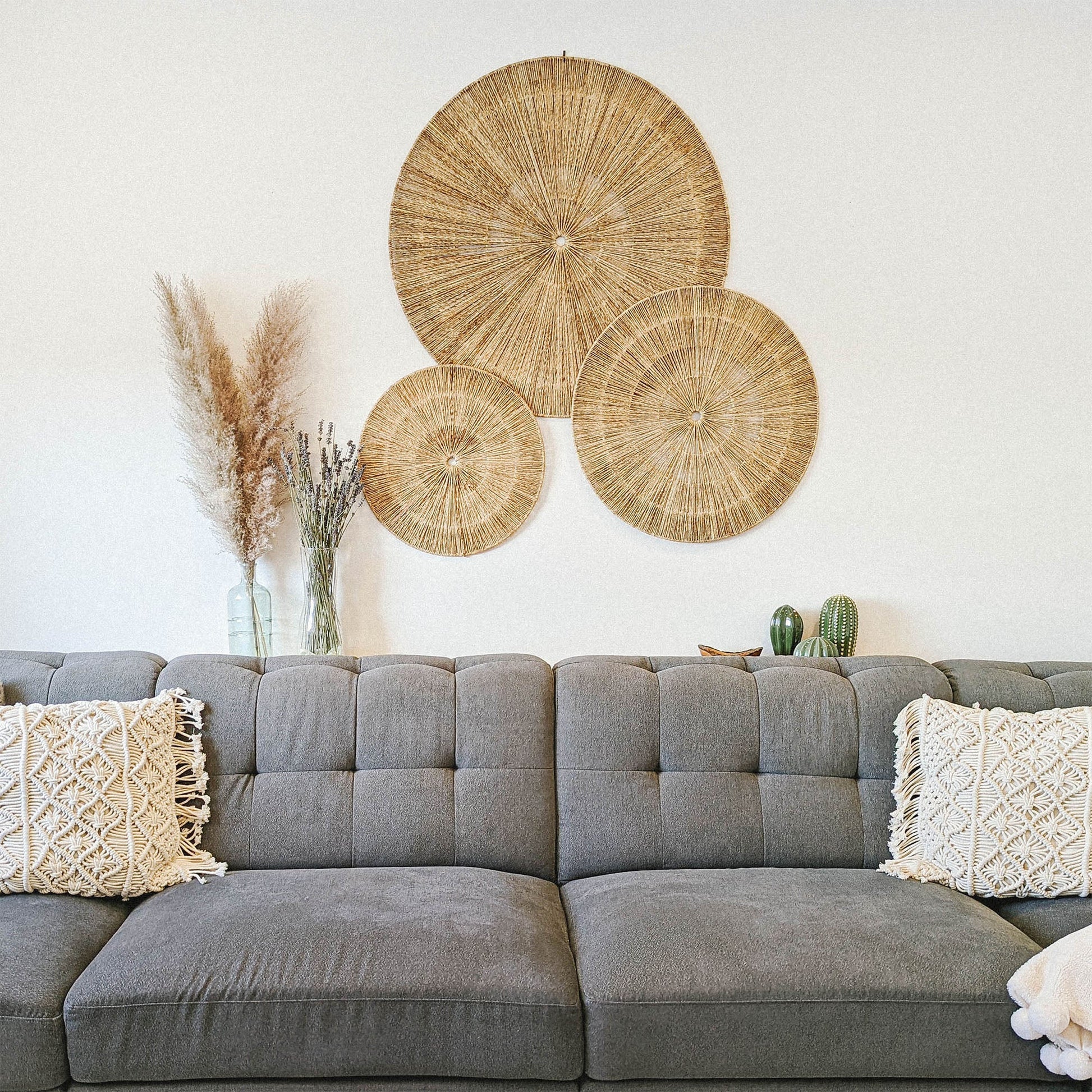 Natural warmth: Offering a gentle gloss and a sunburst pattern, our woven wall art set brings a touch of sunshine into your space, infusing it with a vibrant ambiance.